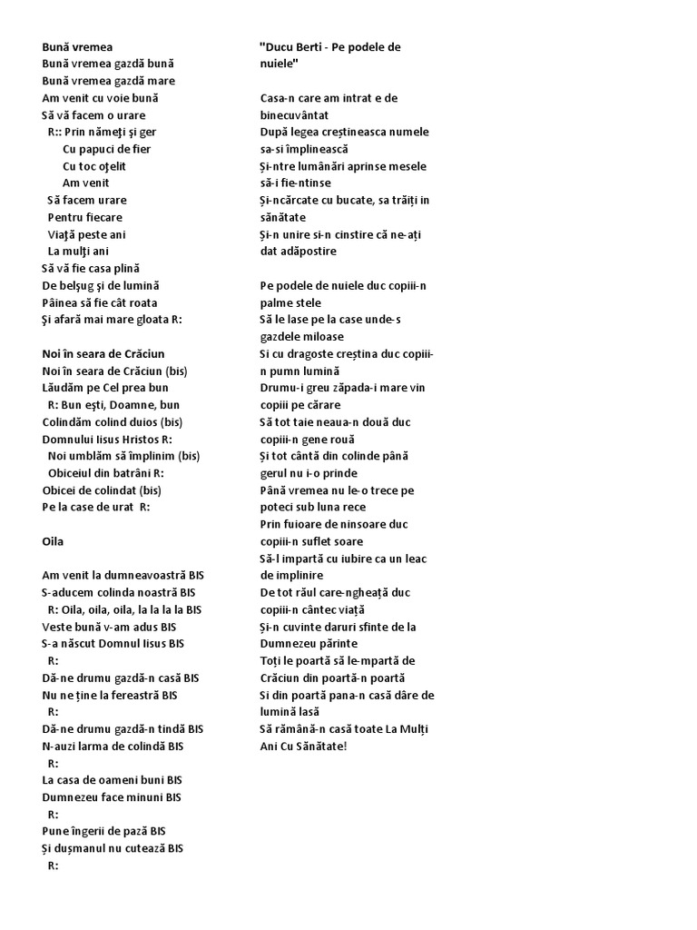 Mai E Vreme De Colinde. De obicei, turnurile au mai multe etaje podite cu scânduri de lemn, iar la ultimul etaj se găseşte un paraclis, tocmai pentru a servi ca spaţiu liturgic pentru obşte chiar şi în vremea vreunui asediu. Ci ședeți la privegheală, (r). Sus boieri, nu mai dormiți. De dragul mariei isi piaptana pletele; Caci gheata se intinde asemeni oglindelor.