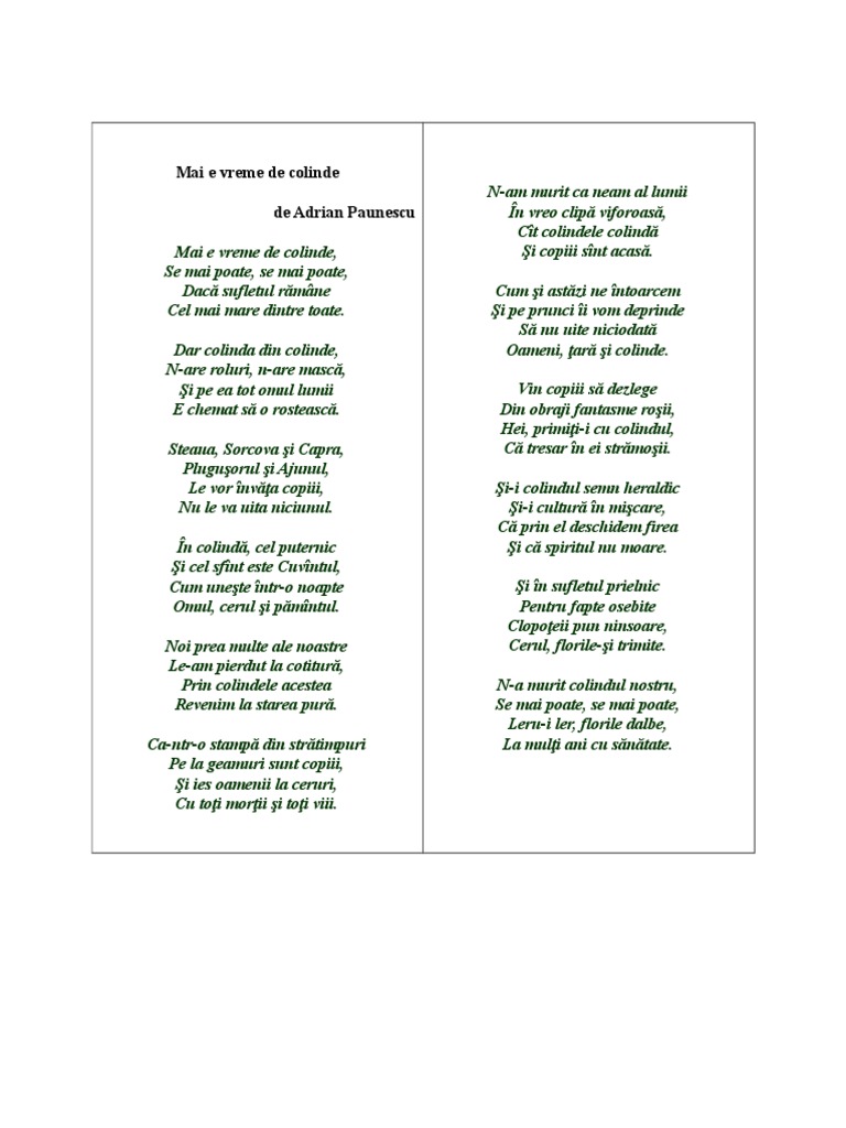Mădularu anemona, cravciuc victoria, pop alis, radu nicole, bretan mara, șerban denisa, varga amelia, dudea alex. Mai e vreme de colinde.(recită: Postată acum 10th february 2020 de dorangelo roman. Mai e vreme de colinde, se mai poate, se mai poate, dacă sufletul rămâne cel mai mare dintre toate. În folclorul românesc colindatul de crăciun este cel mai important obicei popular tradiţional.