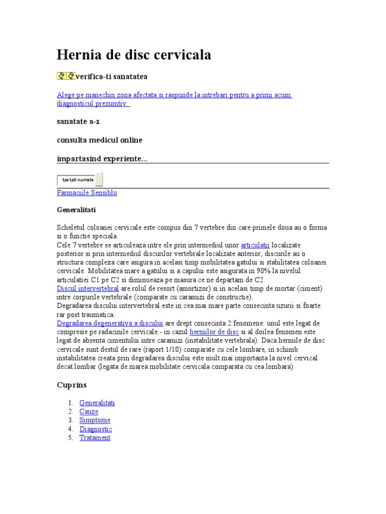 vizitati articolul complet aici : https://centrokinetic.ro/fiziokinetoterapia-explicata/totul-despre-recuperare/hernie-disc-operatie-tratament/ Daca discul herniat se regaseste in partea superioara a coloanei vertebrale, afectiunea se numeste hernie de disc cervicala, iar senzatia de. Hernia de disc poate aparea la orice nivel al coloanei, cel mai des intalnite fiind hernia lombara si hernia cervicala cauze tratament fara operatie. Il convient de rapidement la traiter avant qu'elle n'entraîne des séquelles irréversibles.